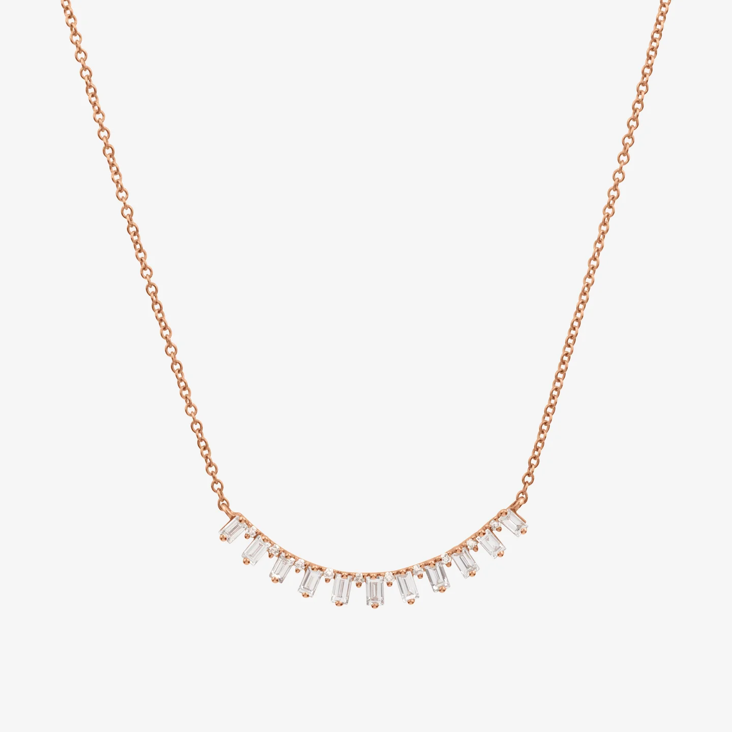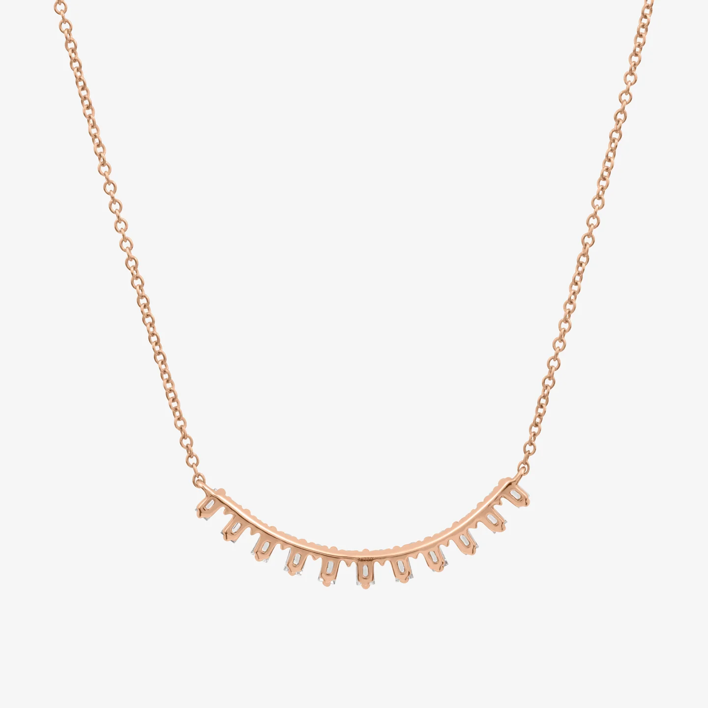 A captivating blend of modern design and timeless allure, meticulously crafted in 18K solid rose gold. This sophisticated necklace features a gracefully curved bar pendant, adorned with a mix of 21 baguette and round conflict-free diamonds, creating a total carat weight of 0.40.